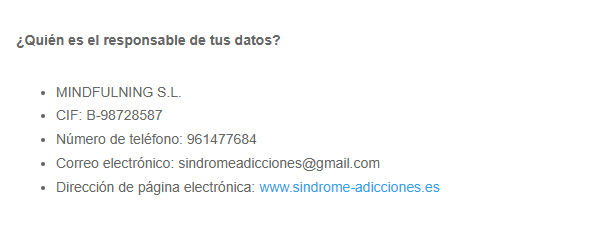 MINDFULNING S.L. cumple con las directrices del Reglamento (UE) 2016/679 del Parlamento Europeo y del Consejo, de 27 de abril de 2016 relativo a la protección de las personas físicas en lo que respecta al tratamiento de datos personales y a la libre circulación de estos datos (RGPD), así como la Ley Orgánica de Protección de Datos y demás normativa vigente en cada momento, y vela por garantizar el correcto uso y tratamiento de los datos personales del usuario. Para ello, junto a cada formulario de recabo de datos de carácter personal, en los servicios que el usuario pueda solicitar a nuestro email, hará saber al usuario, según lo dispuesto en el artículo 15.1 del RGPD, lo siguiente: (i) los fines del tratamiento; (ii) las categorías de datos personales de que se trate; (iii) los destinatarios o las categorías de destinatarios a los que se comunicaron o serán comunicados los datos personales, en particular destinatarios en terceros países u organizaciones internacionales; (iv) el plazo de conservación de los datos personales o, de no ser posible, los criterios utilizados para determinar este plazo; (v) la existencia del derecho a solicitar del responsable la rectificación o supresión de los datos personales o la limitación del tratamiento de datos personales relativos al interesado, o a oponerse a dicho tratamiento; (vi) el derecho a presentar una reclamación ante una autoridad de control; (vii) cuando los datos personales no se hayan obtenido del interesado, cualquier información disponible sobre su origen; (viii) la existencia de decisiones automatizadas, incluida la elaboración de perfiles a la que se refiere el artículo 22.1 y 4 del RGPD, y, al menos en tales casos, información significativa sobre la lógica aplicada, así como la importancia y las consecuencias previstas de dicho tratamiento para el interesado. MINDFULNING S.L. informa que da cumplimiento a la ley 34/2002 de 11 de julio, de Servicios de la Sociedad de la Información y el Comercio Electrónico y le solicitará su consentimiento al tratamiento de su correo electrónico con fines comerciales en cada momento.